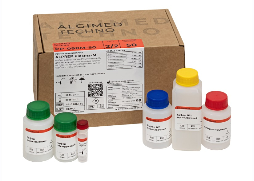 Набор реагентов «ALPREP Plasma-M» для выделения нуклеиновых кислот из плазмы крови на 50 образцов, ТУ BY 193208315.098-2024, кат. PP-098-50 Предназначен для ручного или автоматического выделения ДНК/РНК из плазмы крови человека методом магнитной сорбции.