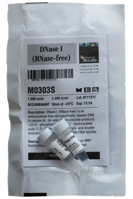 ДНК модифицирующий фермент ДНКаза I (нет РНКазной активности) (2 000 е.а./мл, 1 000 е.а.), арт. M0303 S, New England Biolabs Фермент предназначен для неспецифического расщепления ДНК до ди-, три- и олигонуклеотидов с фосфатными группами на 5’-концах и OH-группами на 3’-концах ; способен расщеплять одноцепочечную ДНК, двухцепочечную ДНК и гибриды ДНК/РНК. Происхождение фермента - штамм E.coli, несущий ген панкератической ДНКазы I быка, слитый с мальтоза-связывающим белком.