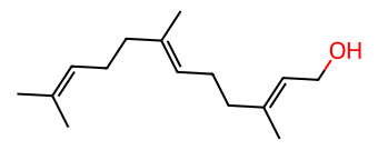 В связи с инвентаризацией склада, пожалуйста, уточняйте актуальные цены и наличие товаров, написав на klad@skygen.com. Бесцветная или светло-желтая жидкость Синоним(ы): 3,7,11-Триметил-2,6,10-додекатриен-1-ол Линейная формула: (CH3)2C=CHCH2CH2C(CH3)=CHCH2CH2C(CH3)=CHCH2OH Номер КАС: 4602-84-0 Молекулярный вес: 222,37 Байльштайн: 1763926 Номер ЕС: 225-004-1 Количество MDL: MFCD00002918 Код UNSPSC: 12352100 Идентификатор вещества PubChem: 24894809 NA.22