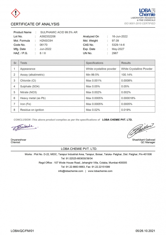 КИСЛОТА СУЛЬФАМИНОВАЯ, CAS 5329-14-6, ФАСОВКА 0.5 КГ, LOBA 06170