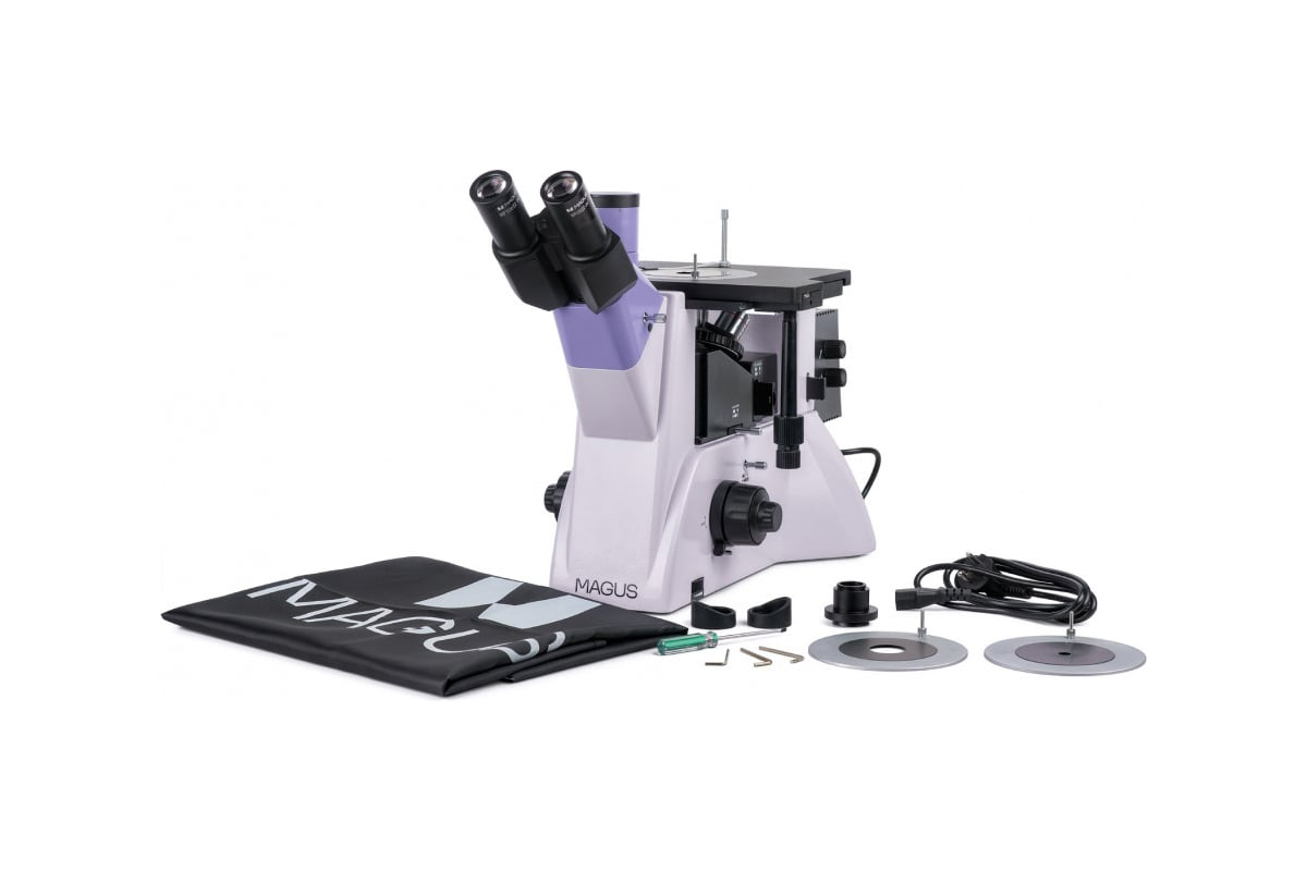Благодаря инвертированной конструкции на металлографическом микроскопе MAGUS Metal V700 BD можно исследовать объекты большого размера и массой до 2 кг. Исследуемая сторона должна быть плоской и обработанной для наблюдений, геометрия остальной части объекта не имеет значения. Микроскоп применяется на предприятиях металлургической и металлообрабатывающей промышленности, в производственных цехах и лабораториях контроля качества, в высших учебных заведениях. При исследованиях используются методы светлого поля, темного поля и поляризованного света. Оптическая схема Тринокулярную визуальную насадку можно разворачивать на 180° при установке на микроскоп. Она имеет отдельный канал визуализации (вертикальную окулярную трубку) с делителем светового потока 50/50 и 100/0. Еще один канал визуализации есть в корпусе микроскопа – делитель светового потока здесь имеет два положения: 100/0 и 0/100. Револьверное устройство находится под образцом, для установки объективов доступно 5 гнезд. После установки объективов, входящих в комплект, одно гнездо револьвера остается свободным, поэтому при использовании дополнительного объектива не придется снимать один из базовых. Объективы планахроматические, имеют увеличенное рабочее расстояние и сконструированы для работы в светлом и темном поле. Увеличение микроскопа в базовой комплектации составляет от 50 до 500 крат. Система освещения Галогенный осветитель отраженного света обладает увеличенной мощностью – 50 Вт достаточно для комфортных наблюдений не только в светлом поле и в поляризованном свете, но и в темном поле. Освещение получается теплым по цветовой температуре, поэтому глаза не устают при длительной работе. Источник света центрируется по трем осям. Наличие апертурной и полевой диафрагм позволяет настраивать освещение по методу Кёлера, а светофильтры упрощают настройку контрастности. Есть устройство простой поляризации со съемными анализатором и поляризатором, также в осветительной системе присутствует устройство для работы в темном поле. Механика Перемещение образца происходит путем перемещения предметного столика по осям X и Y. В центр столика устанавливается поворотная круглая вставка с центральным отверстием диаметром 10 мм, 20 мм или 30 мм. Механизмы фокусировки позволяют настраивать фокус грубо или тонко. Жесткость хода грубой фокусировки регулируется, также грубая фокусировка может быть заблокирована. Коаксиальное расположение рукояток делает работу максимально удобной. Во время работы руки можно положить на стол, чтобы они не уставали. Аксессуары Возможности микроскопа расширяются при использовании дополнительных аксессуаров: окуляров, объективов с большим рабочим расстоянием для светлого и темного поля, цифровых камер, калибровочных слайдов. Основные особенности: • Инвертированная конструкция, изучение крупных объектов массой до 2 кг, круглые вставки в столик с отверстиями 10 мм, 20 мм и 30 мм • Револьвер на 5 объективов, планахроматические объективы с увеличенным рабочим расстоянием для светлого и темного поля, тринокулярная визуальная насадка с возможностью разворота на 180° • Два канала визуализации: на корпусе (делитель 100/0 и 0/100) и вертикальный тубус насадки (делитель 50/50 и 100/0) • Доступные методы исследований: светлое поле, темное поле, поляризованный свет • Настройка ос