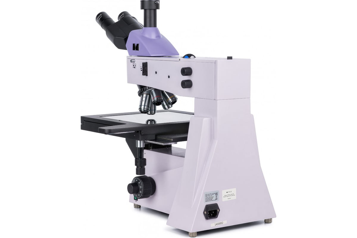 Металлографический микроскоп MAGUS Metal 650 BD предназначен для работы в светлом и темном поле в отраженном свете, а также в поляризованном свете. Он применяется для инспектирования поверхностей интегральных схем, печатных плат, изделий прецизионного формования, фотошаблонов и других широких и протяженных объектов. Оснащен большим предметным столиком и механизмом тонкой фокусировки, шаг которой составляет всего 0,7 мкм. Микроскоп удобен при работе с габаритными объектами на высоких увеличениях. Он востребован в лабораториях по контролю качества, в научных и исследовательских центрах, на кафедрах высших учебных заведений. Оптическая схема Микроскоп оснащен тринокулярной визуальной насадкой, отдельный оптический тубус которой предназначен для установки цифровой камеры (приобретается отдельно). Переключением делителя светового потока свет перенаправляется полностью или в окуляры, или в сторону камеры. Наличие диоптрийной подвижки на левом окулярном тубусе упрощает подстройку оптики под особенности зрения пользователя. Благодаря планахроматическим объективам формируется четкое и контрастное изображение с хорошей прорисовкой мелких деталей. В комплекте идет 5 окуляров– все их можно одновременно установить в револьверное устройство. Они разработаны для работы в светлом и темном поле, на это указывает маркировка BD. При необходимости один из базовых объективов снимается, и на его место устанавливается дополнительный. Увеличение «из коробки» составляет от 50 до 800 крат. Так как револьвер повернут «от наблюдателя», используемый объектив хорошо виден во время работы. Система освещения Источник света – галогенная лампа мощностью 50 Вт, с питанием от сети переменного тока. Она светит в «теплом» спектре, приятном для глаз, поэтому длительная работа с микроскопом не вызывает усталости. Благодаря повышенной мощности работа в темном поле более комфортна и информативна. Яркость освещения регулируется. В систему освещения также входят светофильтры, две диафрагмы (апертурная и полевая), встроенный анализатор и съемный поляризатор, устройство для работы по темнопольному методу. Система обеспечивает комфортную работу при использовании метода Кёлера и во всех поддерживаемых методах контраста. Источник света и диафрагмы центрируются. Механика На микроскопе установлен большой предметный столик: его размер составляет 280x270 мм, а диапазон перемещения по осям X и Y – 204 мм. Рукоятки фокусировки расположены коаксиально в нижней части корпуса, поэтому руки можно не держать на весу во время работы. У грубой фокусировки есть блокиратор и настройка жесткости хода, а тонкая фокусировка может выполняться с шагом 0,7 мкм. Аксессуары Линейка совместимых с микроскопом аксессуаров включает: объективы с увеличенным рабочим расстоянием (с маркировкой BD), окуляры, цифровые камеры, калибровочные слайды. Основные особенности: • Наблюдения в светлом и темном поле, в поляризованном свете • Тонкая фокусировка с шагом 0,7 мкм – точность наведения резкости в 3 раза выше • Инспекционный столик большого размера и с увеличенным ходом по осям X и Y • Визуальная насадка-тринокуляр с отдельным каналом визуализации под цифровую камеру, делитель светового потока с двумя положениями: 100/0 и 0/100 • Галогенный осветитель отраженного света – мощность увеличена до 50 Вт