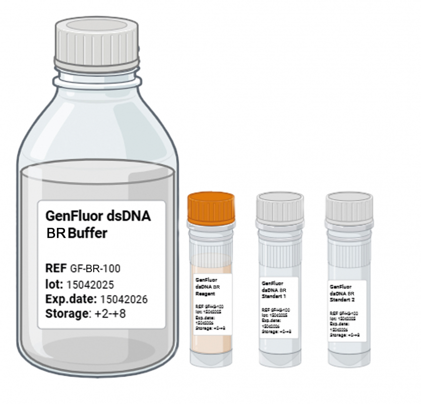 Набор реагентов GenFluor dsDNA BR Assay Kit предназначен для измерения количества двухцепочечной ДНК на флуориметре в диапазоне концентраций 2-1000 нг/мкл. - Набор применяется для точного измерения концентрации ДНК перед использованием в различных молекулярно-биологических приложениях, в том числе ПЦР, секвенировании по Сэнгеру, массовом параллельном секвенировании. - Набор совместим со всеми сериями приборов Qubit Fluorimeter (ThermoFisher Scientific, США), Allsheng Fluo (Allsheng, Китай). - GenFluor dsDNA BR Reagent, входящий в состав набора, высокоселективен в отношении двухцепочечной ДНК, поэтому на работу компонентов набора не влияет наличие примеси одноцепочечной ДНК, РНК, белков