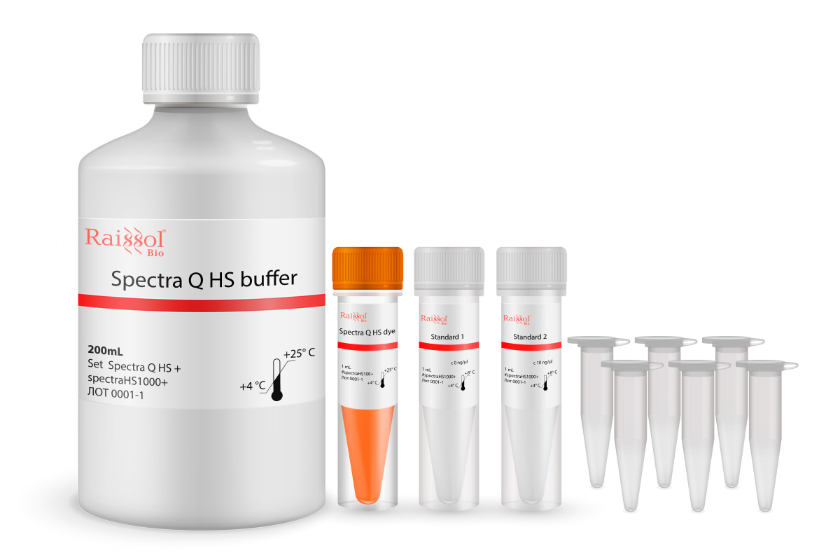 Набор для измерения концентрации ДНК с помощью флуориметра Qubit (Thermo Fisher Scientific, USA) с использованием программы измерения dsDNA High sensitivity - является аналогом системы Qubit dsDNA HS Assay Kit. Показывает более достоверное измерение в области >30 нг/мкл относительно оригинальных реагентов, в измерении серии двукратных разведений. Реагенты набора Spectra HS проявляют в 100 раз сниженное cродство к молекулам РНК, однако большие примеси РНК могут влиять на количественное определение.