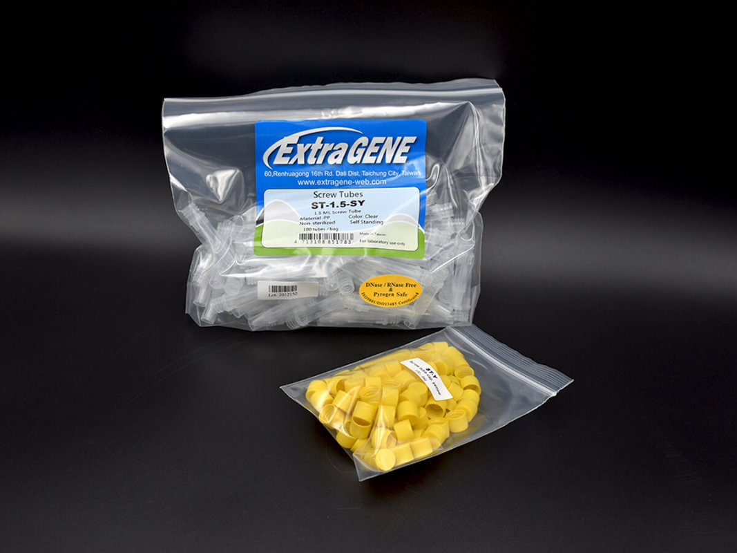 ПРОБИРКИ 1,5 МЛ С ЮБКОЙ C ЗАВИНЧИВАЮЩИМИСЯ ЖЕЛТЫМИ КРЫШКАМИ, БЕЗ УПЛОТНИТЕЛЬНОГО КОЛЬЦА (100 ШТ./УПАК), АРТ. ST-1.5-SY, EXTRAGENE INC.