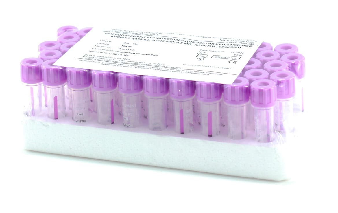 Вакуумные пробирки на 0,5 мл, с EDTA K2, без капилляра, арт. NLD907-K2, Hangzhou Rollmed Co Внимание: у товара отсутствует регистрационное удостоверение. Используются для взятия капиллярной крови при проведении гематологических исследований. Внутренние стенки пробирок обработаны антикоагулянтом - К2 ЭДТА. Материал: ПЭТ. Крышка фиолетового цвета. Срок годности: 12 месяцев