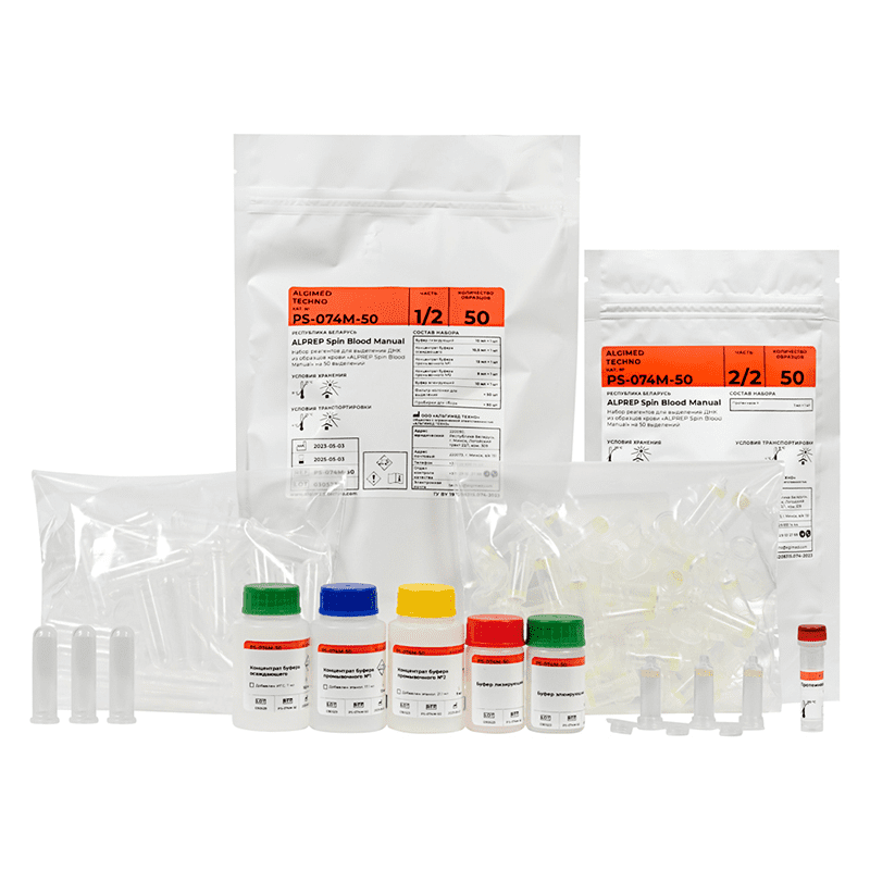 Набор реагентов «ALPREP Spin Blood», на 50 образцов, ТУ BY 193208315.074-2023, кат. PS-074M-50 Предназначен для ручного выделения ДНК из образцов цельной крови человека и животных методом сорбции на мембране спин-колонки.