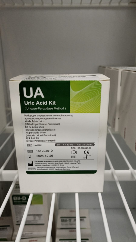 Фасовка: R1 4?40 mL + R2 2?20 mL.  Назначение. Набор реагентов для количественного определения концентрации мочевой кислоты в сыворотке, плазме или моче методом фотометрии. Метод. Реакция с уриказой-перокисдазой.  Хранение и стабильность. Указанного на этикетке, если хранится в закрытой фирменной упаковке при +2...+8 в защищенном от света месте. После вскрытия флакона реагент остаётся стабильным в течение 28 дней, если хранится в охлаждаемом отсеке анализатора. Не допускайте загрязнения реагентов. Не замораживайте реагенты. Оптическая плотность реагента. Оптическая плотность реагента при 546 нм должна быть <0,1A. Совместимость с анализаторами Mindray BS-240pro/BS-200E.