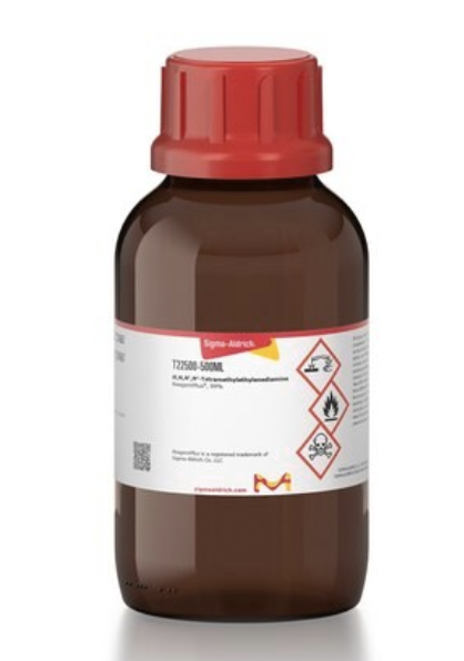 N,N,N',N'-Тетраметилэтилендиамин (TEMED) — химическое соединение, широко используемое в биохимии и молекулярной биологии, особенно при проведении полиакриламидного гель-электрофореза (PAGE). Он служит катализатором для образования свободных радикалов в присутствии персульфата аммония, что инициирует полимеризацию акриламида и N,N'-метиленбисакриламида, образуя гелевую матрицу для разделения макромолекул. Основные характеристики: Синонимы: 1,2-Бис(диметиламино)этан, TMEDA Молекулярная формула: C?H??N? Молекулярная масса: 116,20 г/моль Номер CAS: 110-18-9 Чистота: ?99% Плотность: 0,775 г/см? Температура кипения: 119–121 °C Температура вспышки: 20 °C Физические свойства: TEMED представляет собой прозрачную жидкость с легким аминным запахом. Он смешивается с водой, этанолом и большинством органических растворителей. Применение: Основное применение TEMED — катализатор полимеризации при приготовлении полиакриламидных гелей для электрофореза белков и нуклеиновых кислот. Он ускоряет образование свободных радикалов в системе персульфат аммония–TEMED, что приводит к быстрой и контролируемой полимеризации геля. Меры предосторожности: TEMED является легковоспламеняющимся и токсичным веществом. При работе с ним необходимо использовать средства индивидуальной защиты, такие как перчатки и защитные очки, а также работать в хорошо проветриваемом помещении или вытяжном шкафу. Хранение: Рекомендуется хранить TEMED в плотно закрытой таре в прохладном, сухом и хорошо проветриваемом месте, вдали от источников огня и тепла.