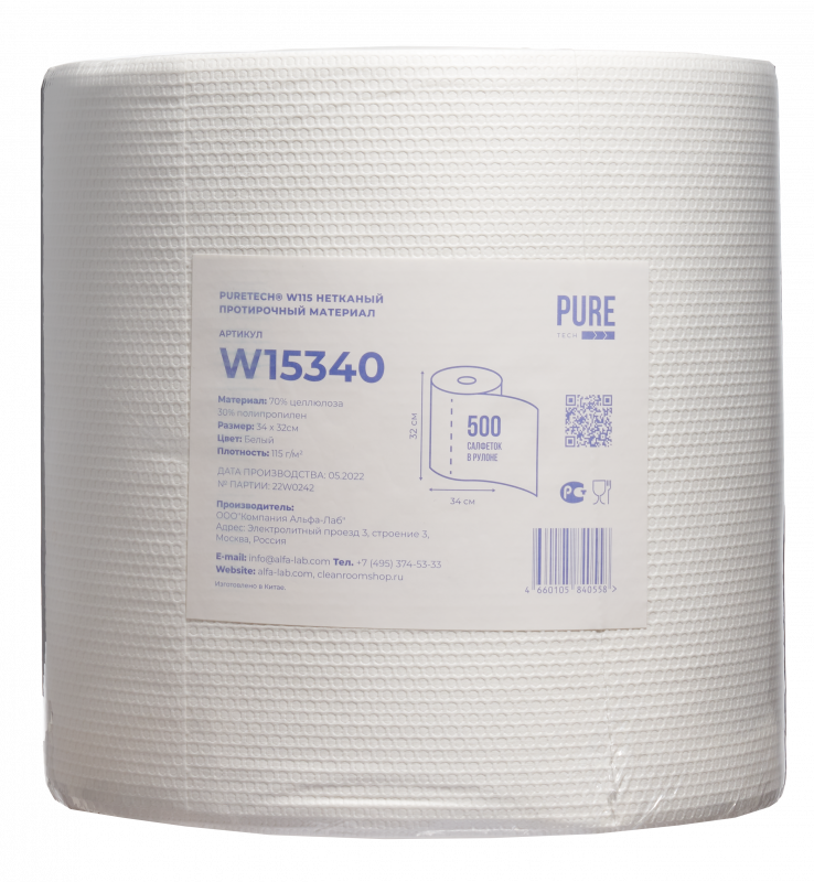 PURETECH® W115 НЕТКАНЫЙ ПРОТИРОЧНЫЙ МАТЕРИАЛ 115ГР/М2, 1СЛОЙ, БЕЛЫЙ, 34Х32СМ, 500 Л/РУЛОН