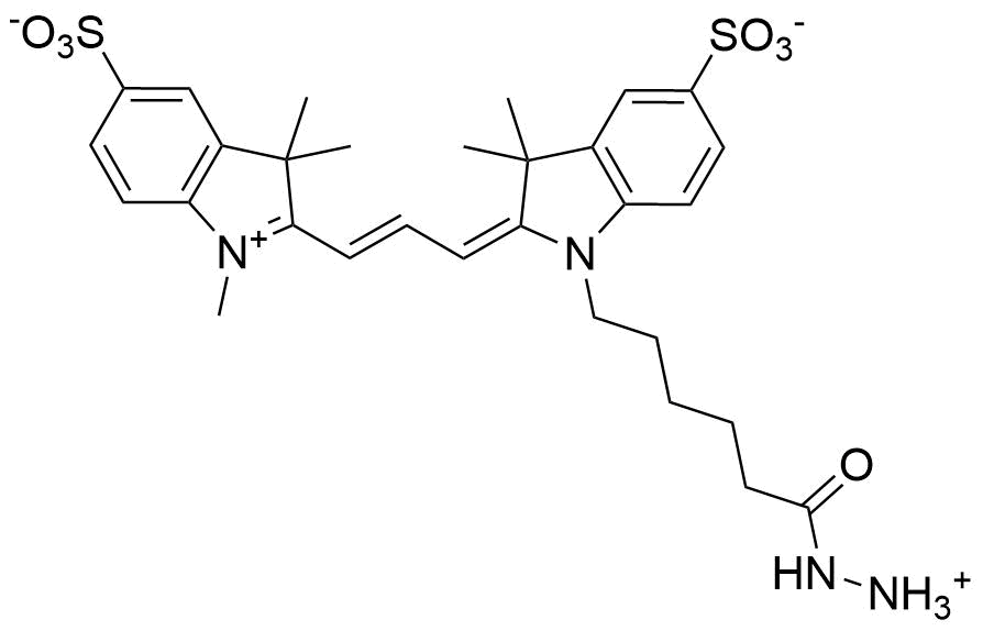 Гидразид красителя Cyanine3 с сульфогруппами, хорошо растворимый в воде и легко реагирующий с карбонильными соединениями. Остаточный срок годности Товаров составляет не менее 2/3 от полного срока годности.